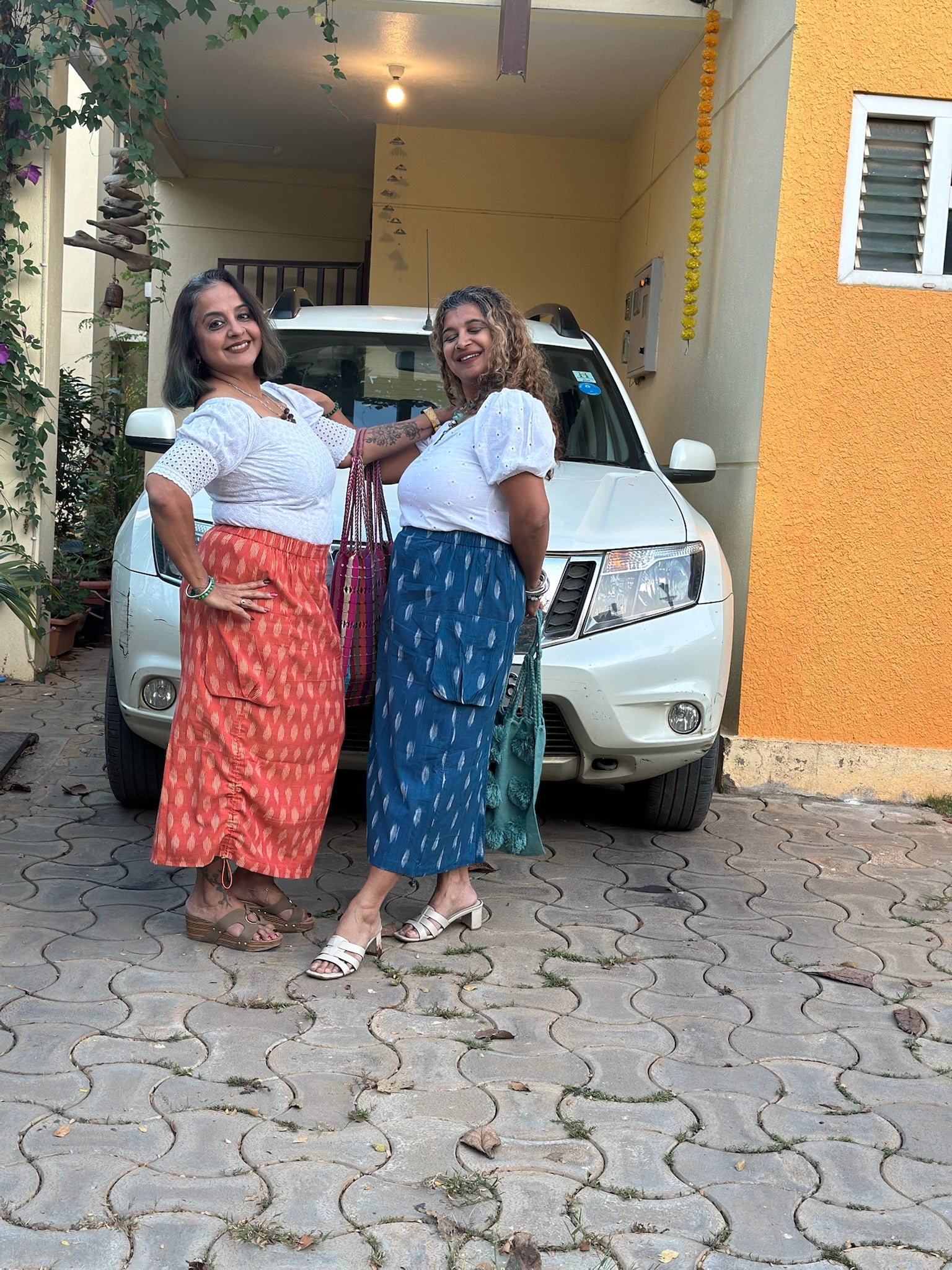 Draw string Skirt with side pockets in handloom Ikkat weave.